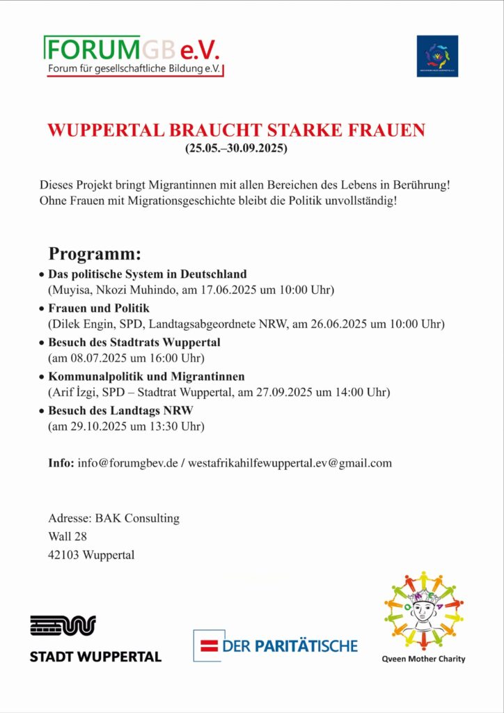 Unser Projekt, das darauf abzielt, Frauen mit Migrationshintergrund in allen Lebensbereichen zu stärken, wird erweitert und fortgesetzt. Nach Düsseldorf kommen nun auch in Wuppertal Frauen mit Migrationshintergrund in diesem Projekt zusammen. Die aktuellen Bedingungen zeigen deutlich: Nicht nur einzelne Städte, sondern ganz Deutschland braucht starke Frauen. Geben Sie diesem Projekt Kraft und unterstützen Sie uns. Wir möchten noch mehr Frauen mit Migrationshintergrund erreichen.